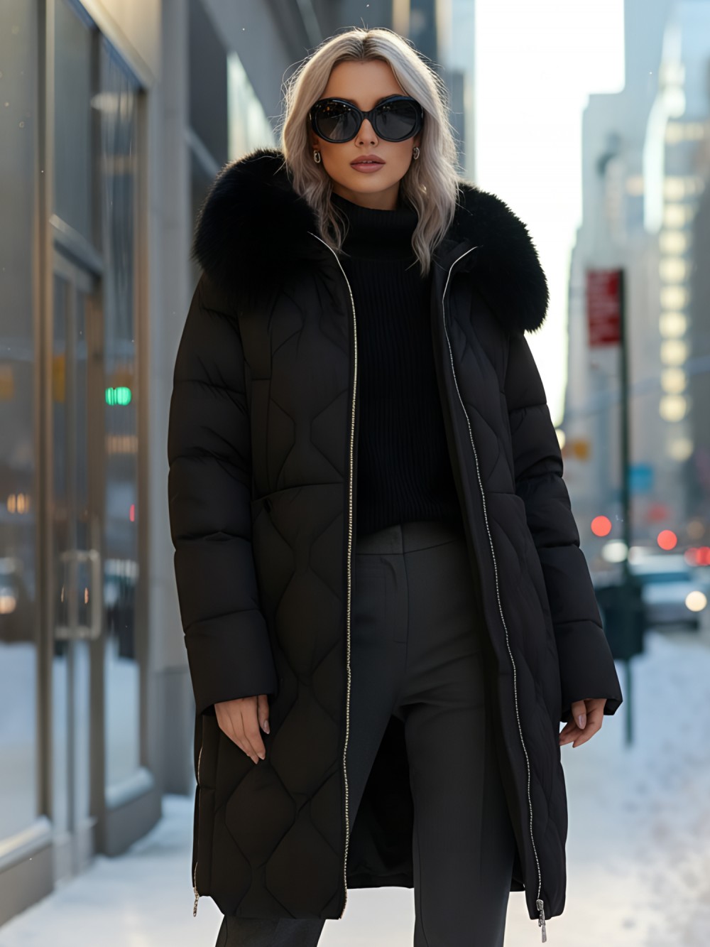 Пять благородных оттенков коллекции осень-зима 2025 – глубокий черный, роскошный коричневый, изысканный светло-коричневый, элегантный темно-коричневый и благородный темно-зеленый – великолепно сочетаются с натуральным мехом песца. Удлиненный силуэт до колена и свободный крой идеальны для размеров 48-56.