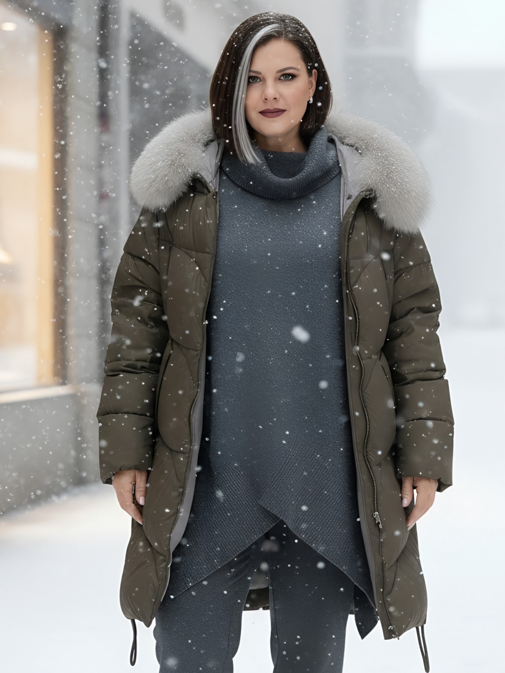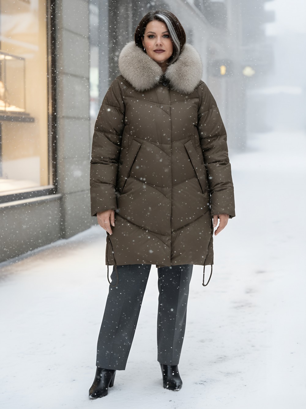 Четыре изысканных оттенка коллекции осень-зима 2025 – благородный черный, элегантный темно-коричневый, утонченный светло-коричневый и стильный хаки – безупречно гармонируют с натуральным мехом песца. Удлиненный силуэт до колена и свободный крой созданы для размеров 46-54.